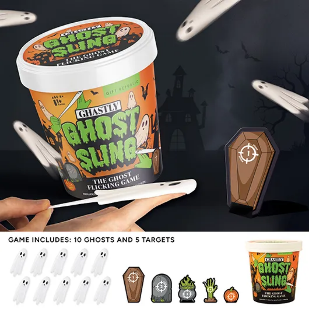 Unleash your inner ghost slinger with the Ghastly Ghost Sling, the frightfully fun flicking game that’s perfect for Halloween parties, family nights, or any time you want to send chills and giggles flying! Simply strap on one of the 10 included sticky ghosts, aim at the haunted targets, and launch your spooky spectres to score big.