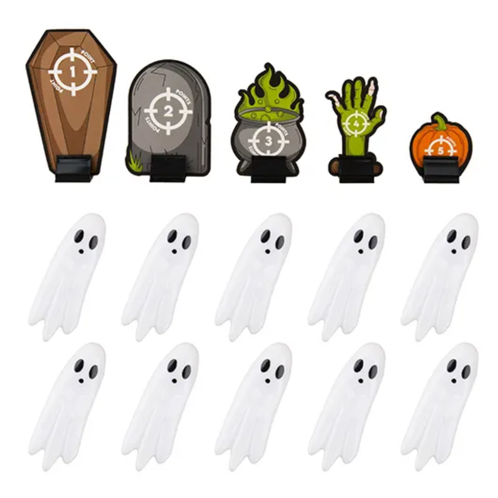 - Includes everything you need – 10 sticky ghost slingers, 5 haunted targets with stands, and full instructions