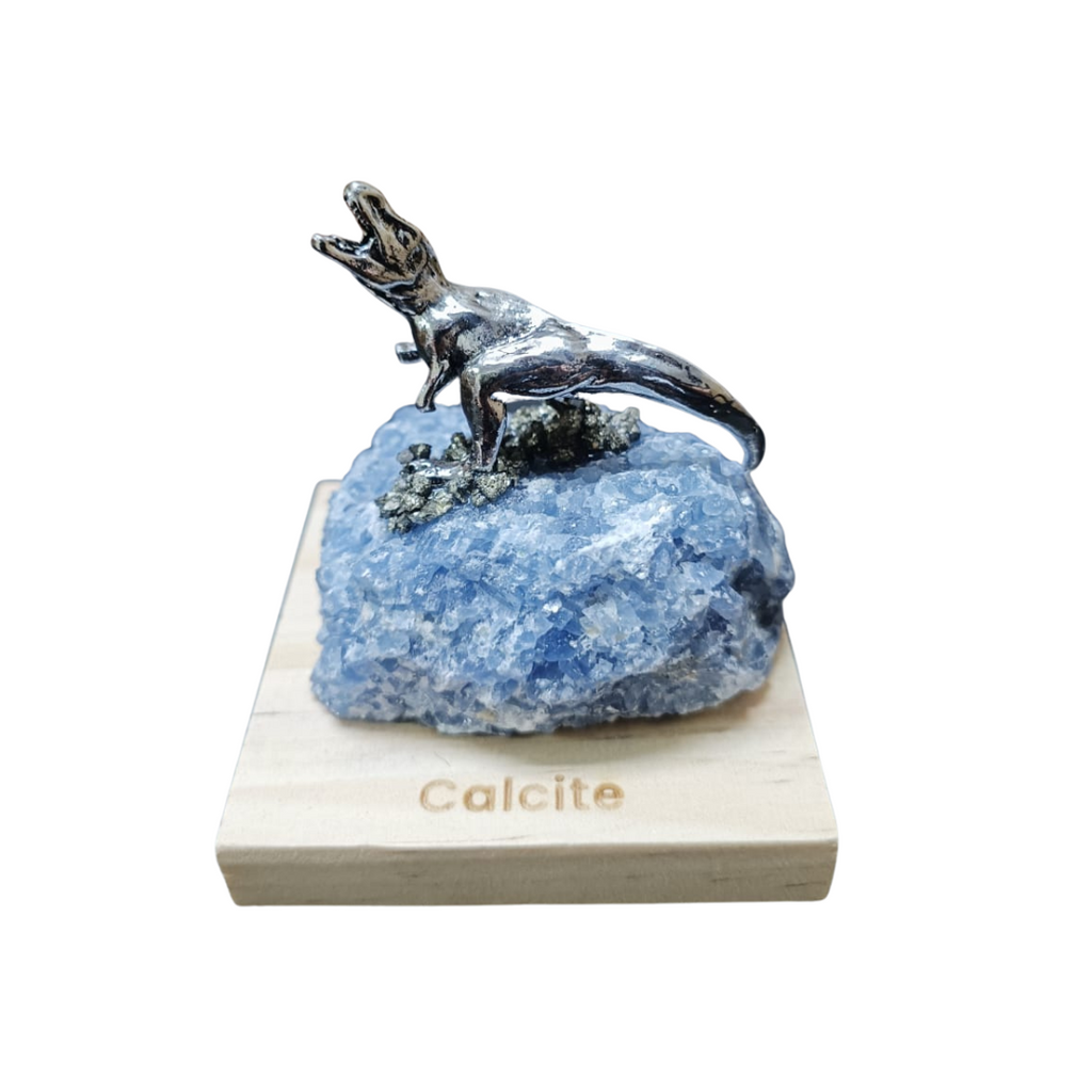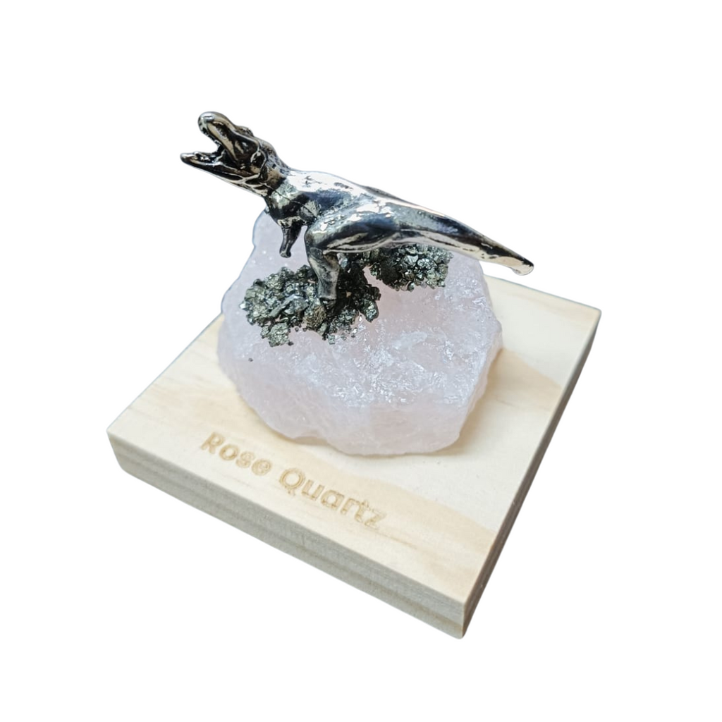 Materials: Genuine mineral specimen, metal dinosaur, wooden base