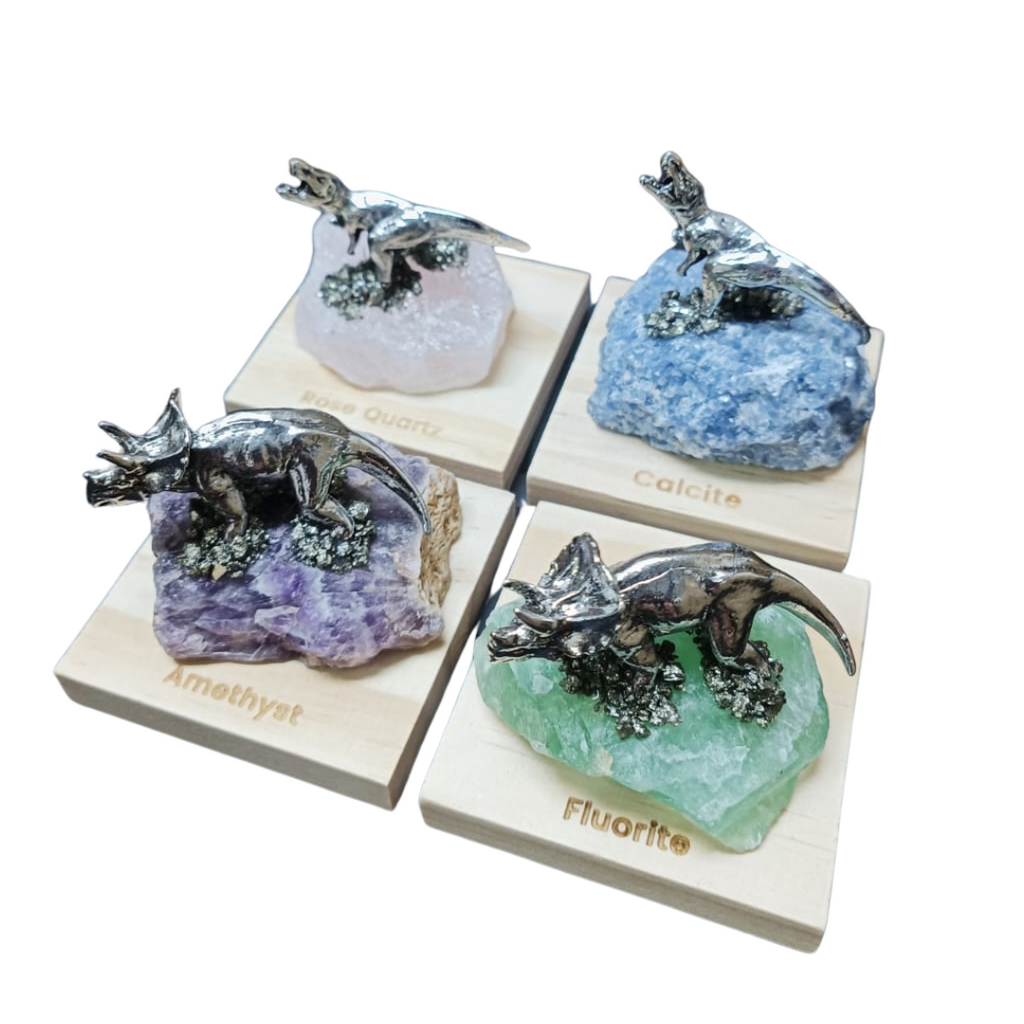 Bring a touch of prehistoric charm to your collection with these fun and eye-catching dinosaur displays. Each piece features a miniature metal dinosaur figure securely mounted on a genuine polished mineral specimen, combining natural history with timeless fascination.