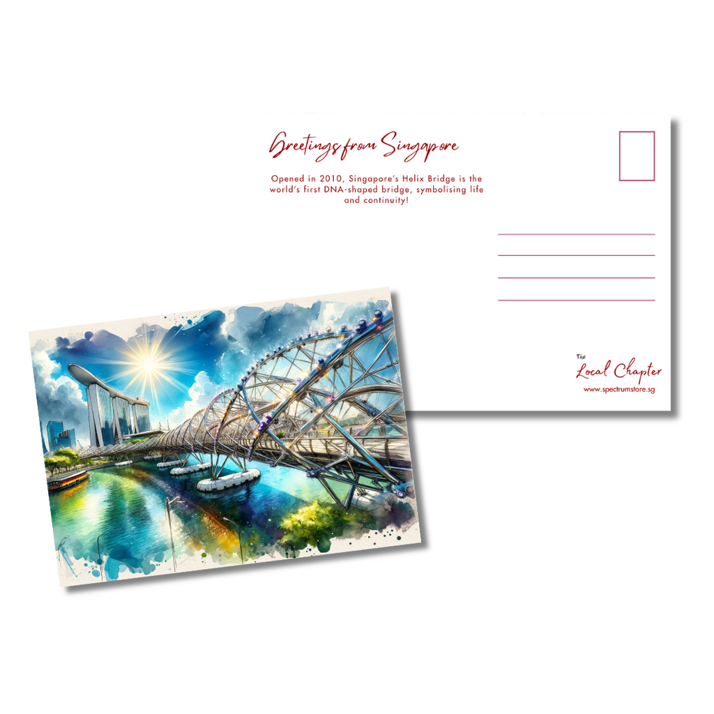 Send a piece of Singapore’s architectural beauty with this postcard featuring the Helix Bridge. Inspired by its stunning double-helix structure, this design celebrates innovation and elegance in the heart of the city.