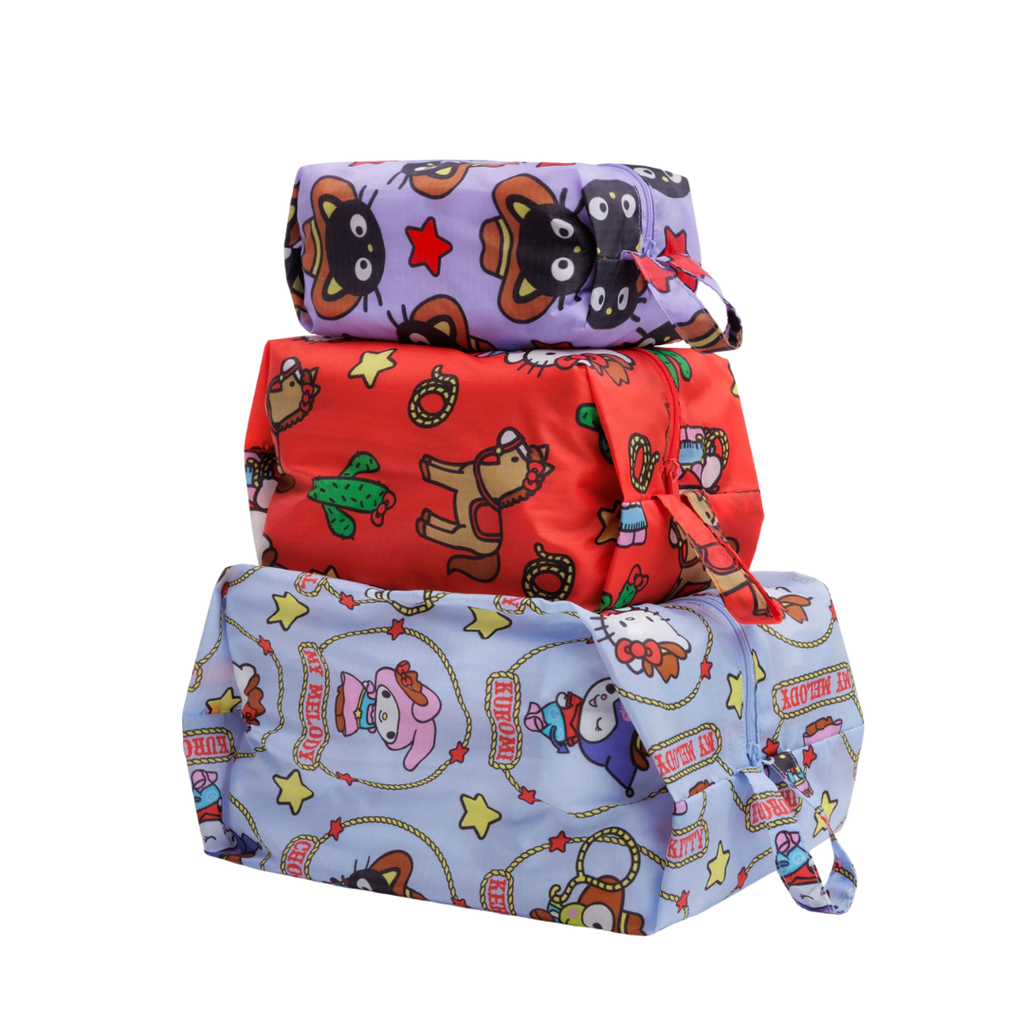 A set of three zippered pouches for travel and organization, with loops for carrying and hanging on the go. Perfect for packing, organizing your bag, or home tidying.