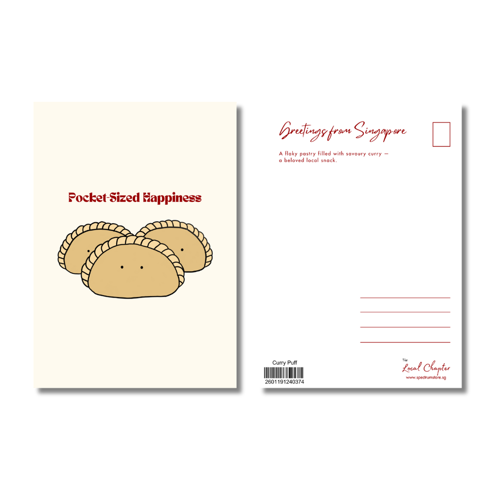 Send a warm taste of Singapore through the mail with this Little Local Loves ostcard in curry puff. Inspired by the iconic local snack with its flaky crust and savoury filling, this playful design celebrates a well-loved treat that’s enjoyed any time of day.