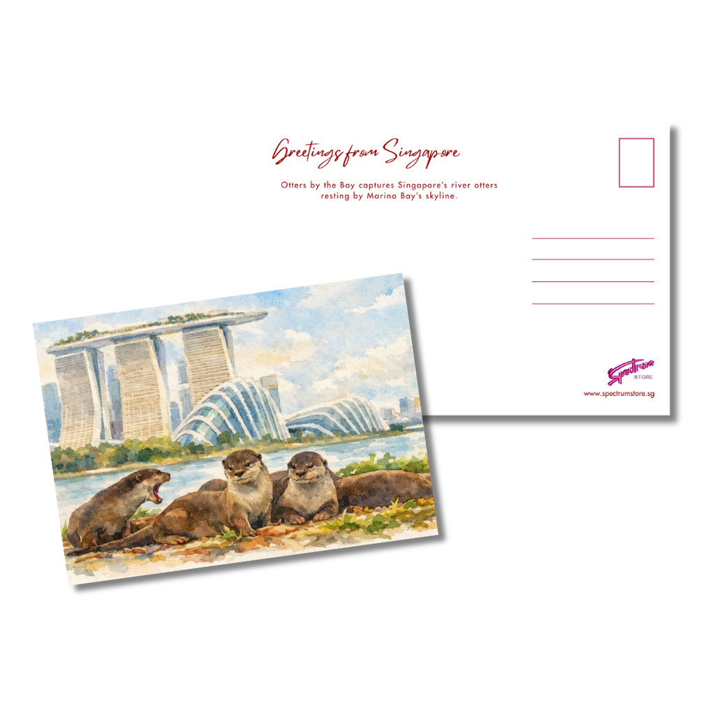 Celebrate a delightful slice of Singapore with this postcard featuring otters by the bay. Inspired by the playful smooth-coated otters often seen near Marina Bay, this design captures a charming moment where nature meets the city’s iconic waterfront skyline.