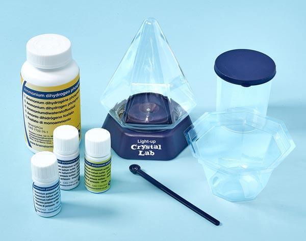 Contains the chemicals to make your crystals, a light-up pyramid display with LED base, measuring cup with lid, spoon and octagonal container.